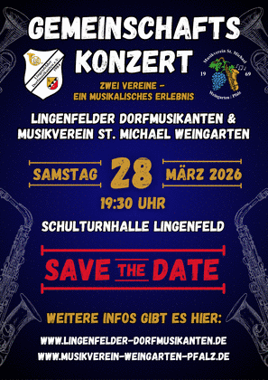 Die Lingenfelder Dorfmusikanten und der Musikverein St. Michael Weingarten laden zum Gemeinschaftskonzert am 28. März in die Schulturnhalle nach Lingenfeld ein. Hier werden Stücke, wie zB. "80er Kulttour", "Pacific Dreams" oder "Frank Sinatra Classics" von beiden Orchestern gemeinsam präsentiert!